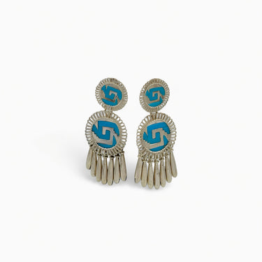 The Echo Shields Earrings by Oro de Monte Albán transform ancestral symbolism into a statement of motion and sound. Each earring features two hand-inlaid turquoise medallions with the signature chimalli (Aztec shield) design, framed in radiant sterling silver. Suspended below are a fringe of cascading drops that move and chime gently, evoking ceremonial rhythm and grace.With their bold structure and subtle musicality, these earrings are both visually striking and culturally rooted. They offer a dynamic balance between form, movement, and tradition—perfect for collectors of wearable heritage.