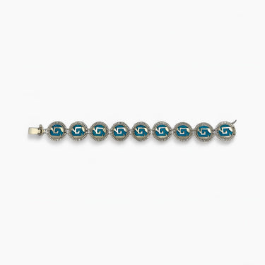The Turquoise Shield Link Bracelet by Oro de Monte Albán brings together tradition and symmetry through a series of handcrafted medallions. Each circular link features a stylized chimalli—the Aztec shield—framed by finely worked silver and filled with vibrant turquoise inlay. The repeating glyph creates a rhythm across the wrist, rooted in ancient symbolism yet refined in execution.This piece balances strength and elegance, honoring warrior iconography with artisanal polish. Ideal for everyday wear or as part of a statement jewelry collection, it embodies a legacy of cultural craftsmanship in every detail.