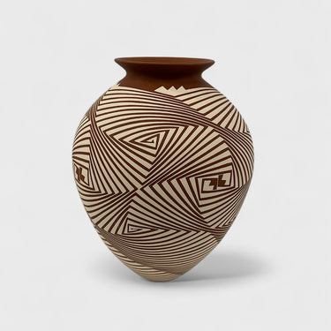 Mesmerizing in its symmetry and hypnotic in design, Echo Lines Vessel by Rodrigo Perez is a masterclass in balance and optical rhythm. Set against a smooth, cream-colored surface, rich terracotta lines radiate across the rounded form in triangular bursts, spirals, and wave-like intersections. The pattern’s perfection is broken only by strategically placed angular symbols—subtle nods to Paquimé iconography.